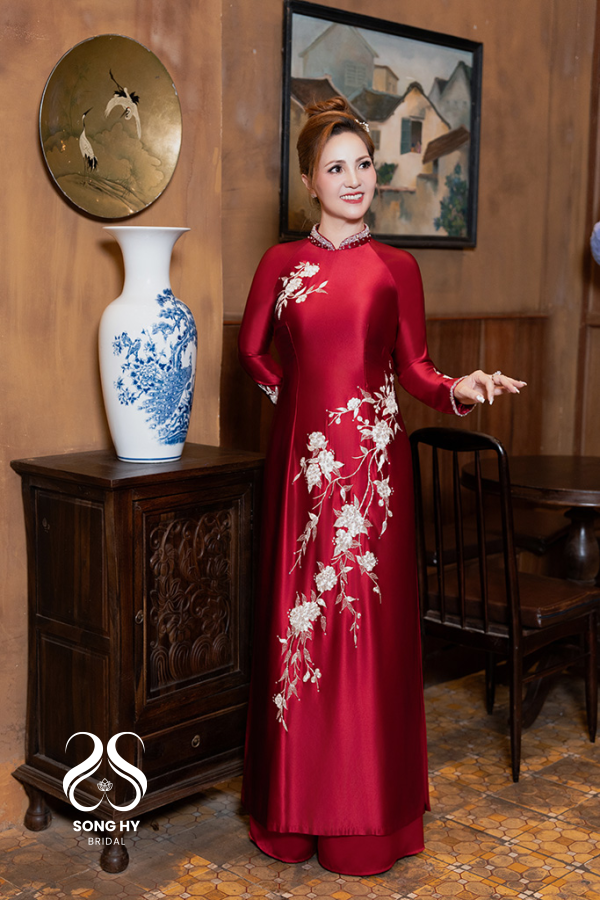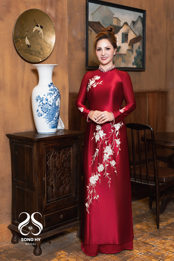 Khác với áo dài thường, áo dài mẹ thêu tay được chế tác công phu, mỗi đường kim mũi chỉ đều thể hiện sự khéo léo, giúp trang phục trở thành một tác phẩm nghệ thuật độc đáo.