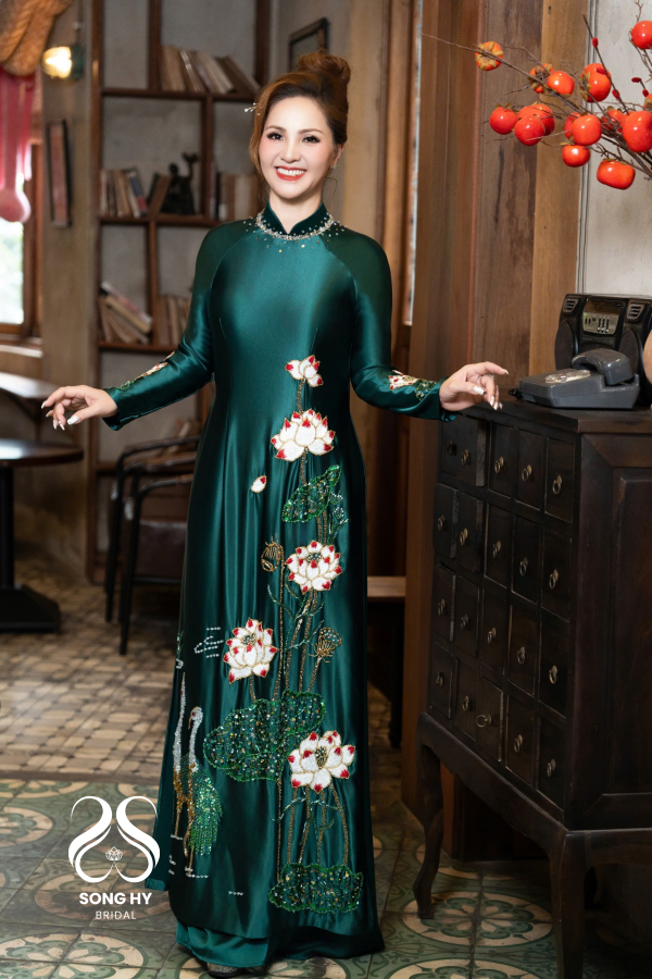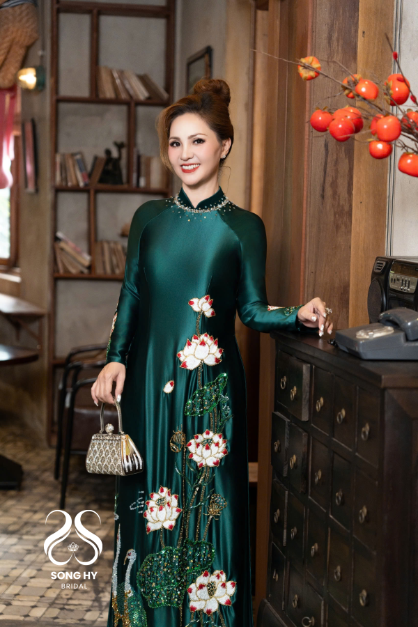 Với thiết kế thuê tay hoạ tiết hoa sen bung nở nổi bật, mẫu áo dài bà sui satin cao cấp đang là một trong những mẫu áo được các cô lựa chọn trong ngày trọng đại của con mình tại Song Hỷ.