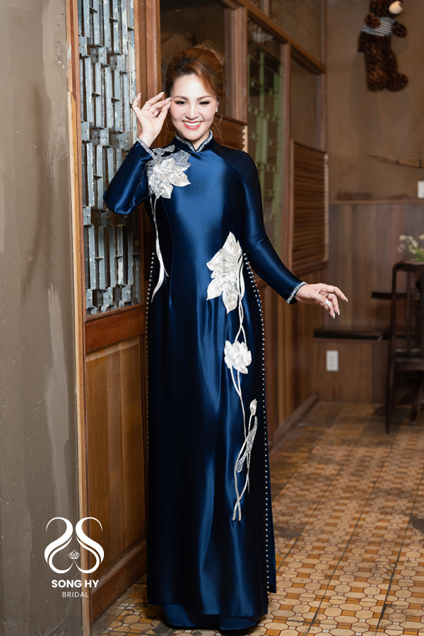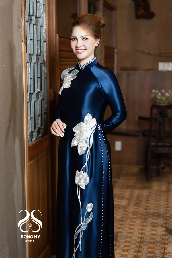 Áo dài bà sui với chất liệu satin cao cấp may đo chuẩn form dáng tôn từng đường cong vẻ đẹp của các mẹ, phối hợp cùng hoạ tiết thêu tay chỉ mạ bạc với hoa sen nổi bật. Là thiết kế nổi bật cho các bà mẹ
