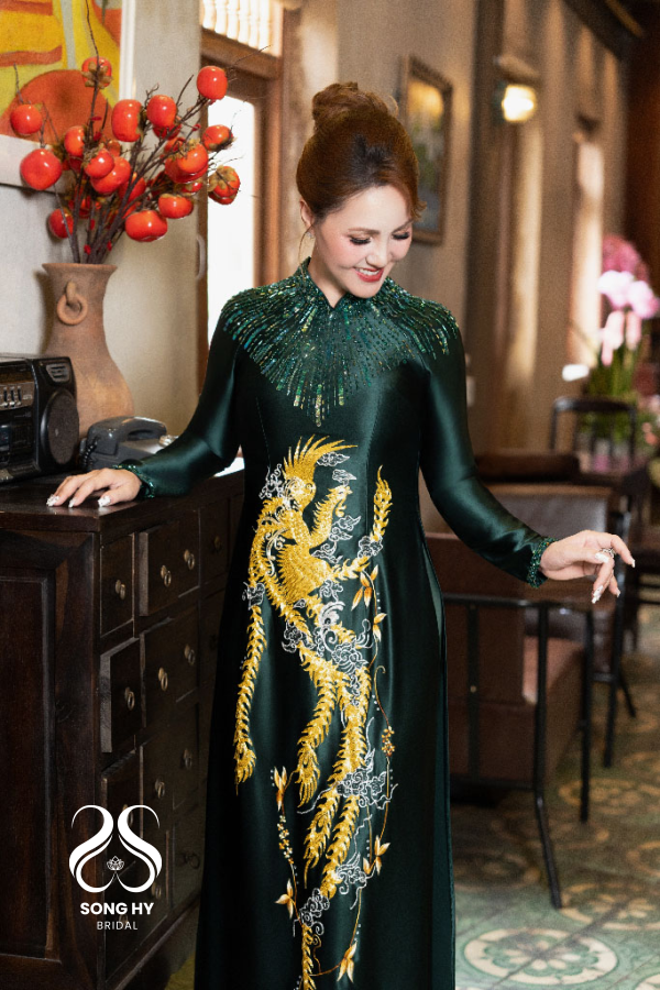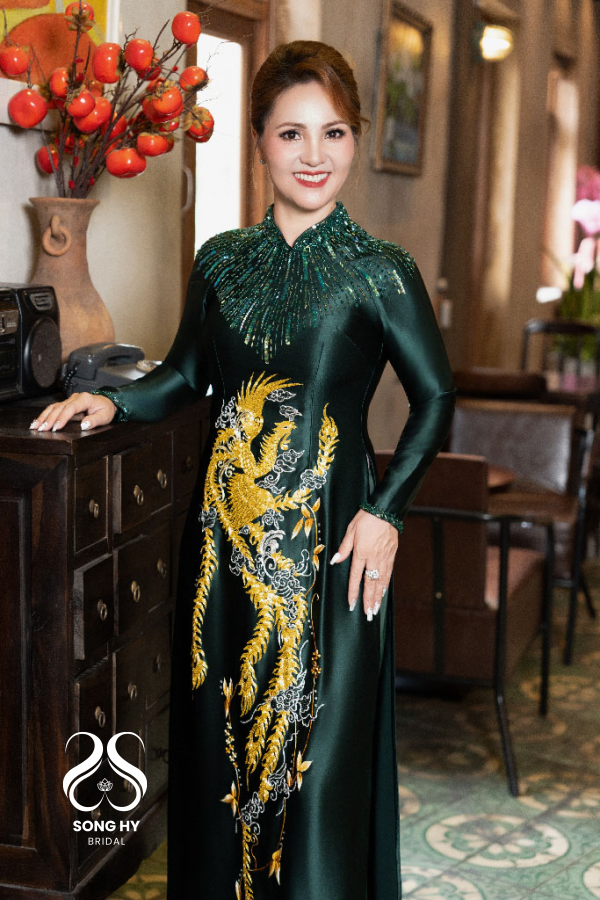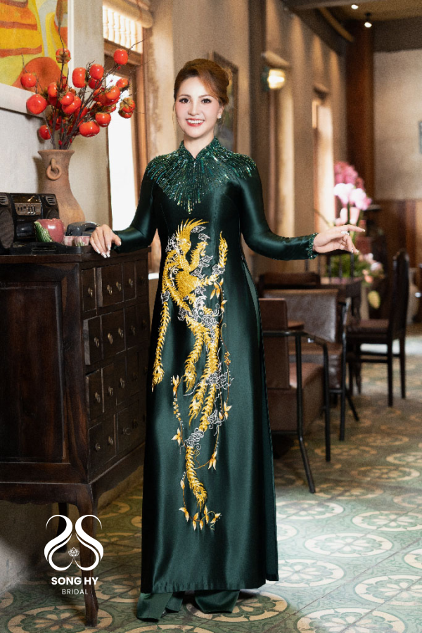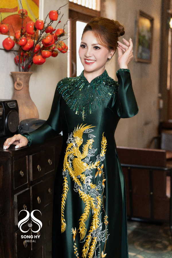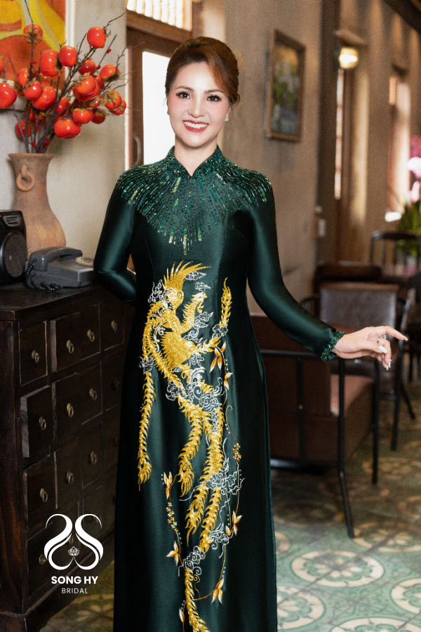 Áo dài bà sui xanh lá đậm thêu tay phượng hoàng