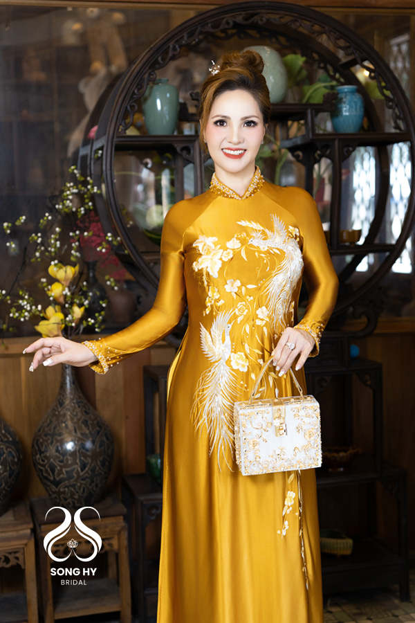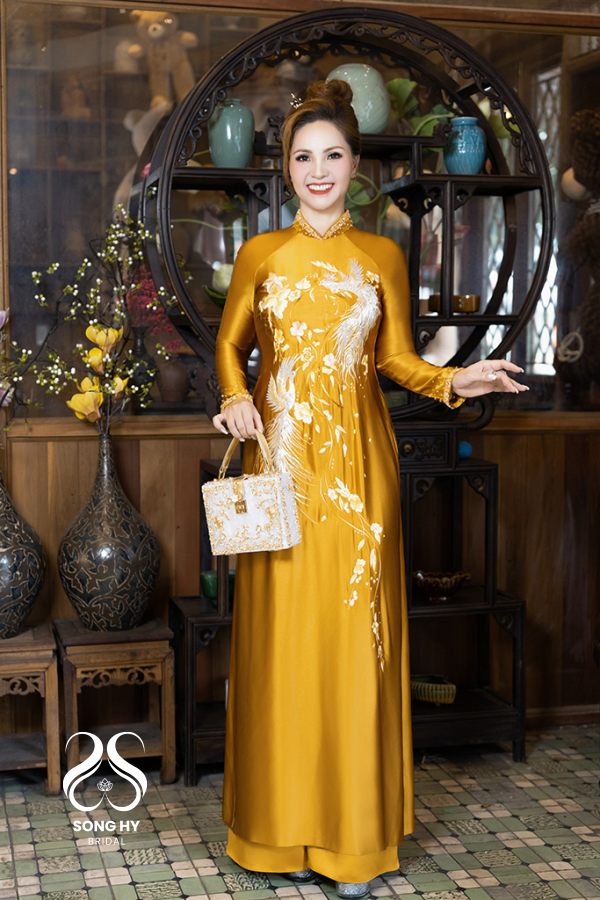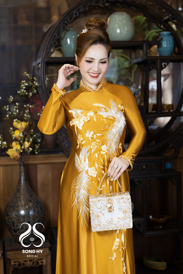 Áo dài bà sui với chất liệu satin cao cấp may đo chuẩn form dáng tôn từng đường cong vẻ đẹp của các mẹ, phối hợp cùng hoạ tiết thêu tay chỉ mạ bạc phượng hoàng nổi bật. Là thiết kế nổi bật cho các bà mẹ trong ngày trọng đại của các con